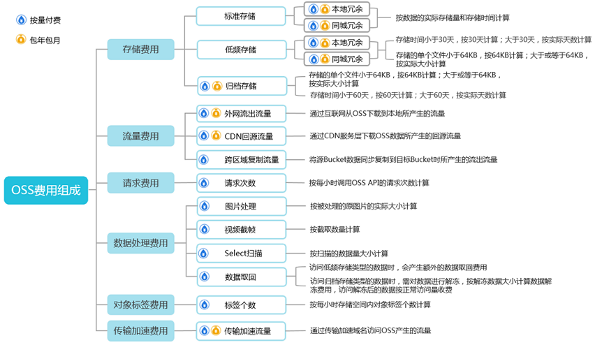 - 注意 OSS 的所有收费项目都是单独计费的,例如您在 OSS 的存储空间内存放了 100GB 数据,会产生存储费用;若每天有不同的客户通过外网访问您的数据,则您还会额外产生请求费用和外网流出流量费用。