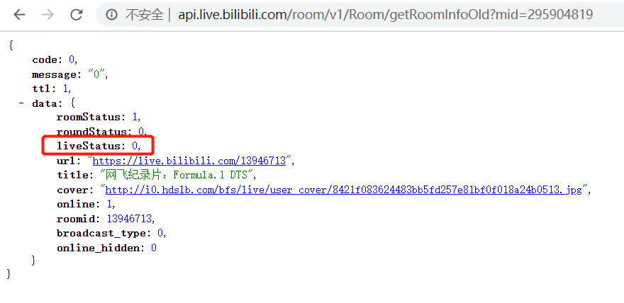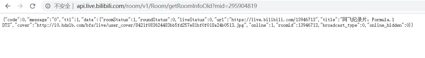 只需要打开URL:http://api.live.bilibili.com/room/v1/Room/getRoomInfoOld?mid=295904819 (URL的mid=填写主播的UID,不是直播间号!!! )