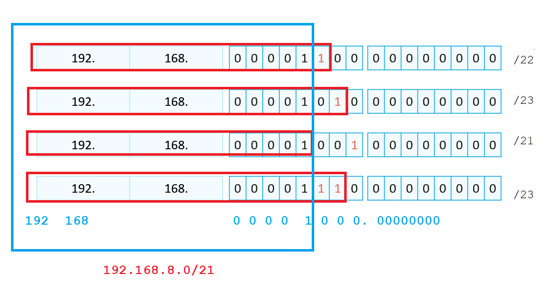 - CIDR容许任意长度的掩码长度,将IP地址看成连续的地址空间,可以使用任意长度的前缀分配,多个连续的前缀可以聚合成一个网络,该特性可以有效减少路由表条目数量。