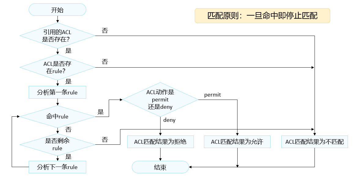 - ACL匹配规则有两种,默认规则下按rule ID从小到大匹配具体看ACL的匹配机制
