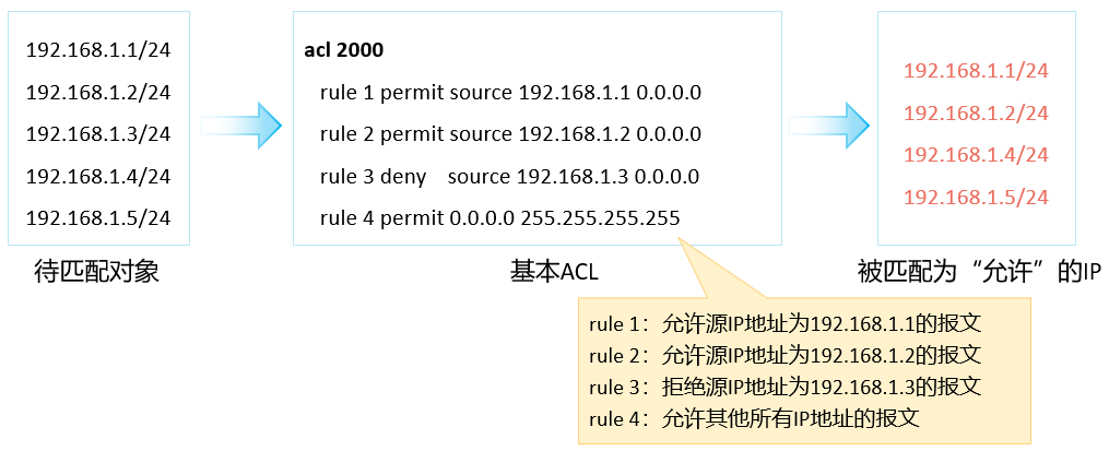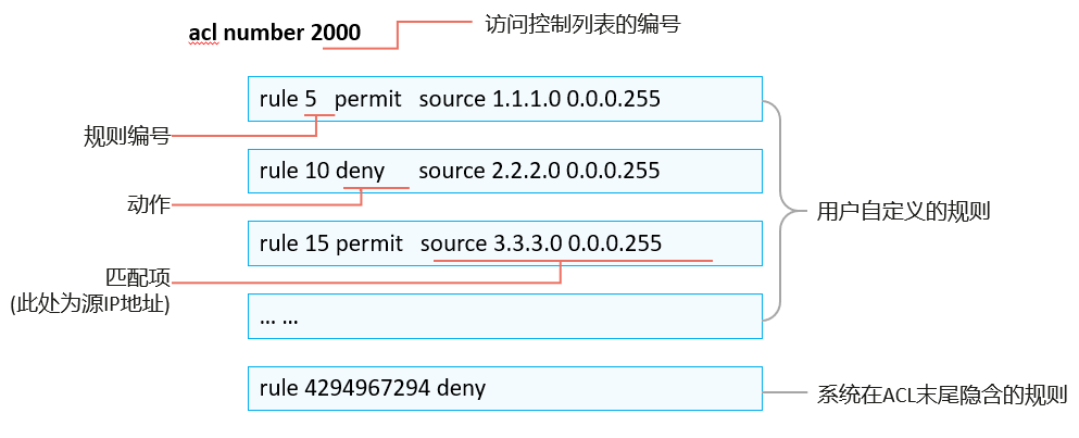 ACL由若干条permit或deny语句组成。每条语句就是该ACL的一条规则,每条语句中的permit或deny就是与这条规则相对应的处理动作。