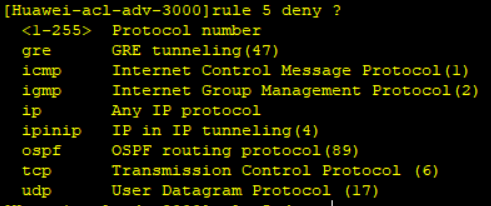 | 高级ACL | 3000~3999 | 源IP地址、目的IP地址、 源端口、目的端口、协议 |