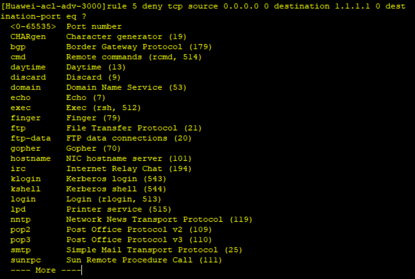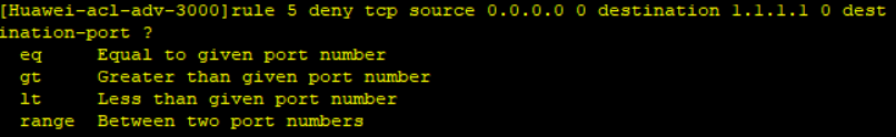 - 高级ACL动作(deny拒绝/permit 允许)后加二层协议,destination-port后加 (取值范围) + (三层协议/端口号)