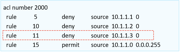 如果在acl 3000中插入`rule deny ip source 1.1.1.1 0`(目的IP地址是主机地址,优先级高于上图中的两条规则),系统将按照规则的优先级关系,重新为各规则分配编号。插入新规则后,新的排序如下。